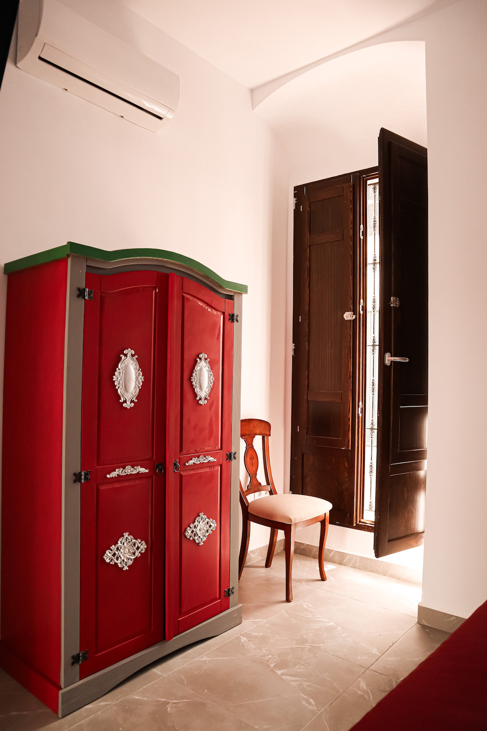 Habitación doble en planta baja con cama de matrimonio, baño privado y una decoración marcada por los tonos rojizos. Es un espacio acogedor y con personalidad, pensado para descansar con comodidad.