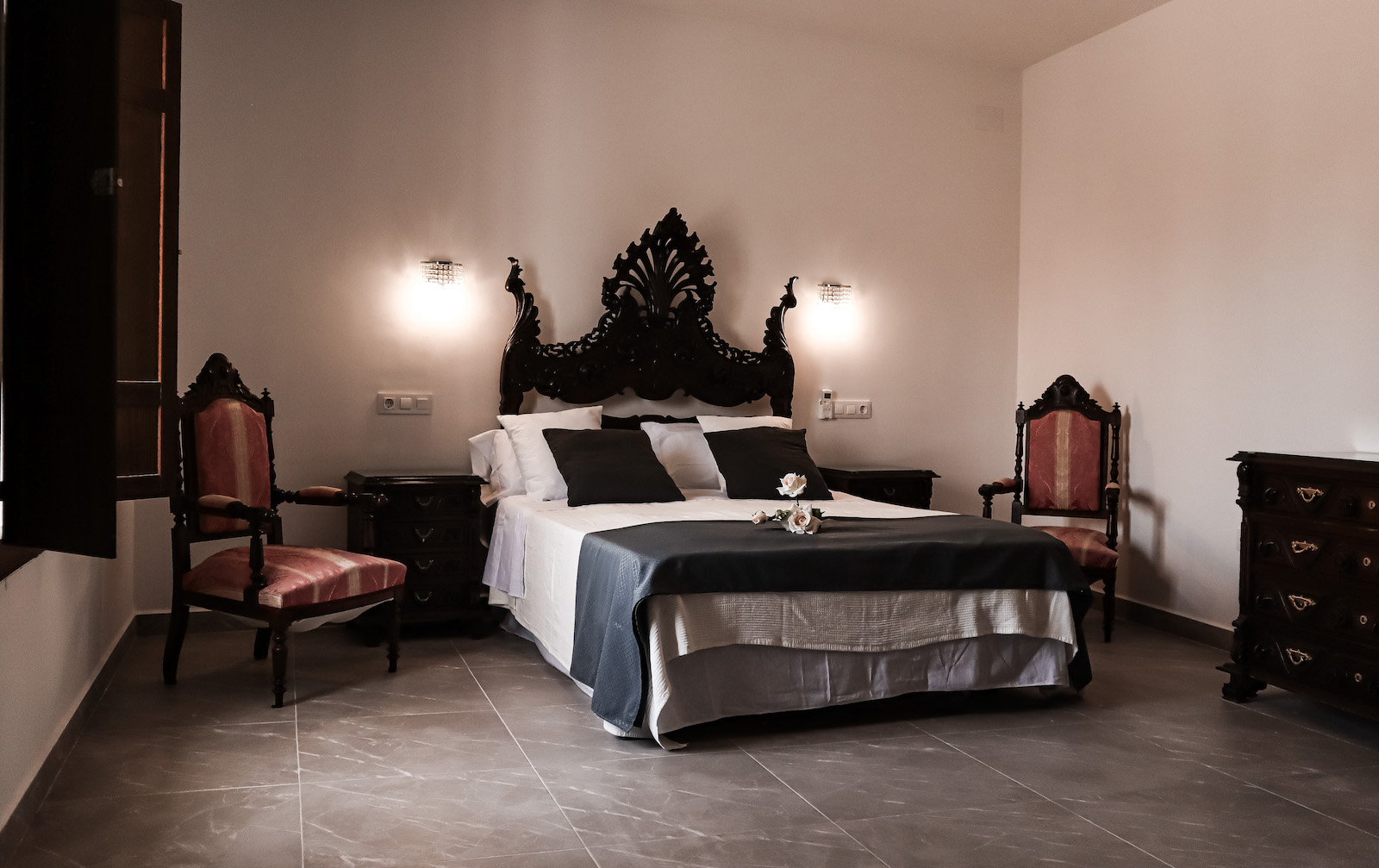 Suite en la planta superior con una estética serena y contemporánea, marcada por los tonos grises y un ambiente especialmente tranquilo.